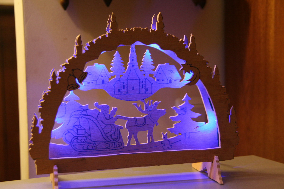 Last winter I wanted to build a "bogen*" for christmas. Initially I started doing it by CNC, but my small sherline XY would have been way too small. (I think I have the g-code for it somewhere, or at least a dxf outline). Anyways, beeing to big I ended up printing it, transferring it to some wood, and fretting it by hand (using a fretsaw). After that it was pretty easy to add some blue LED's and a small PSU to power them. Last Christmas went pretty fast, and I never got around to take a snapshot of the finished thing, so here it is.