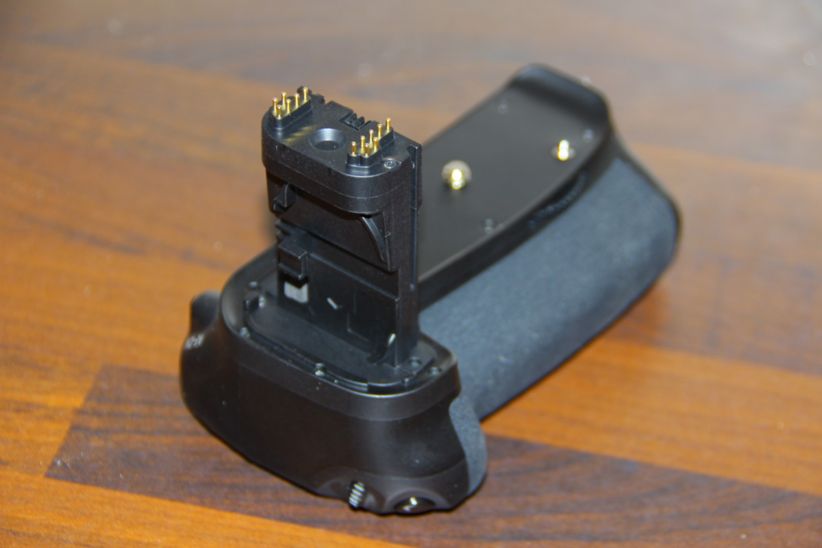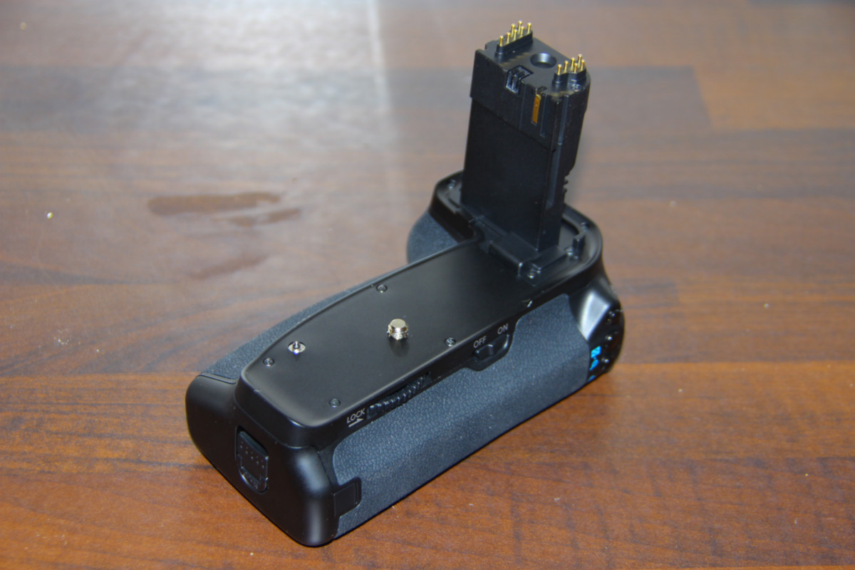 The grip (the Meike version) takes 2 LP-E6's or 6 regular AA batteries, just like the Canon grip. There is another aftermarket grip which only takes 2 LP-E6's, but uses a different loading mechanism (like the grip on the Canon 7D you can simply take out either of the batteries while the camera is still switched on).