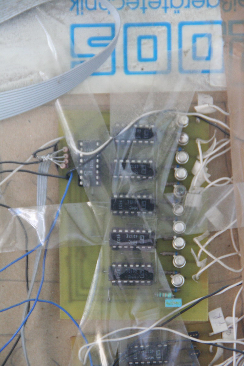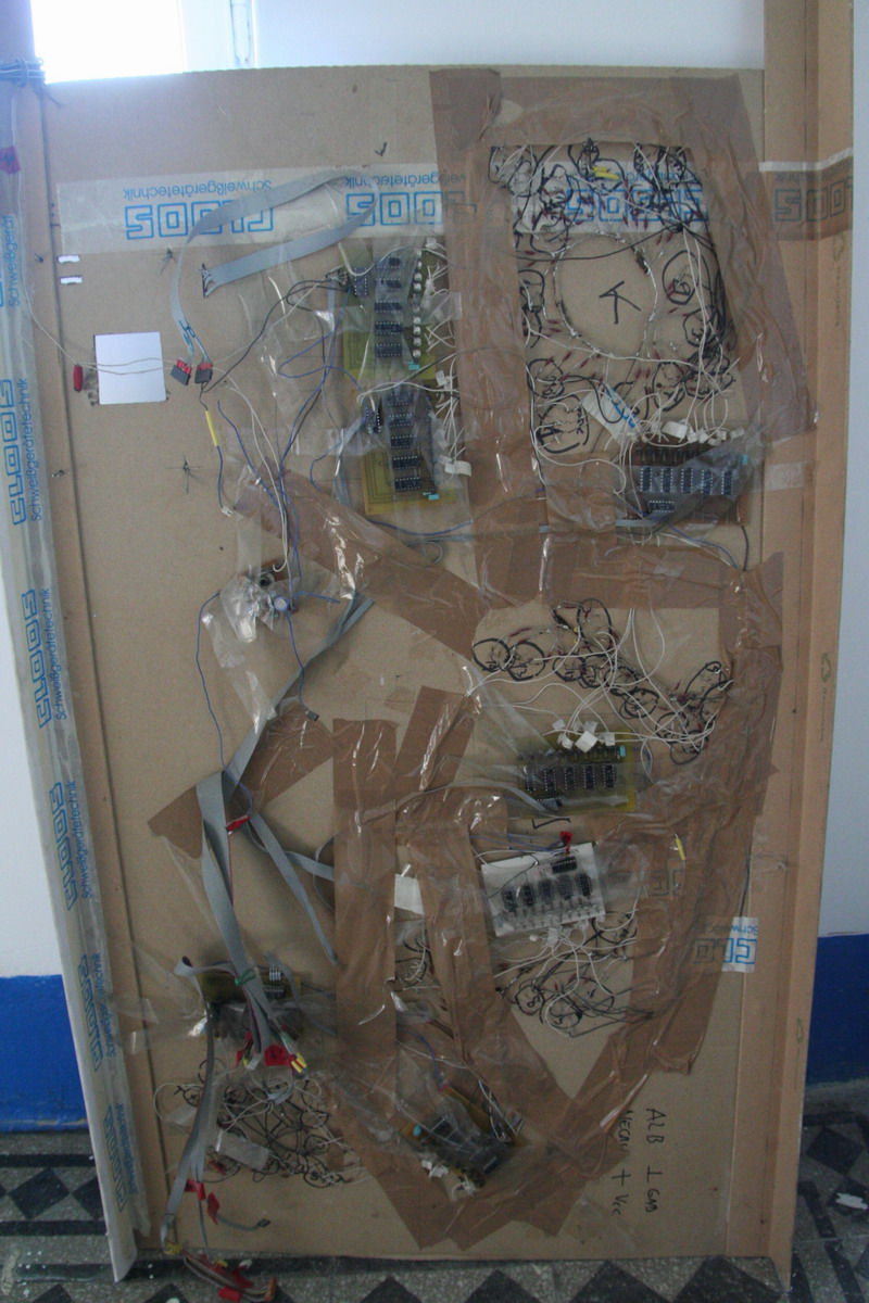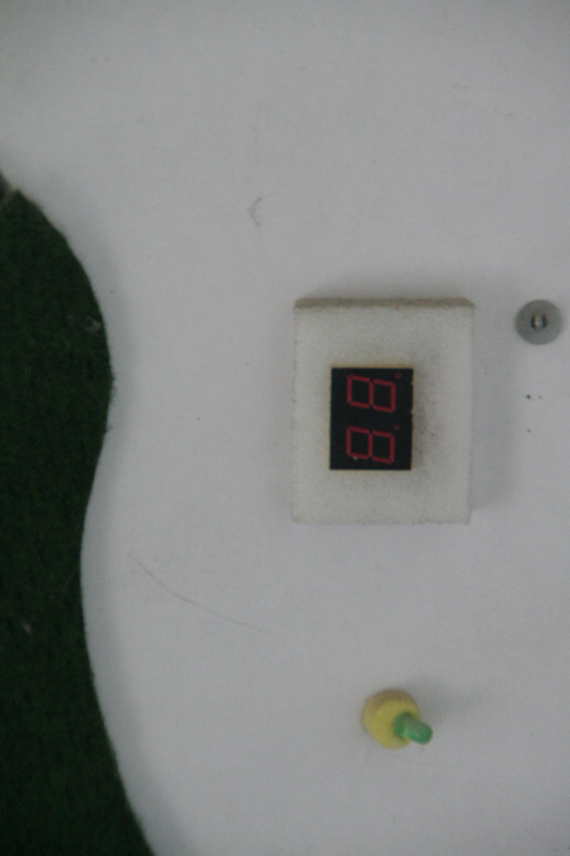 Be gentle on the backside "hackiness" ;) It was one of the first real projects we did (the first micro controller based project ever..). We had to drive about 135 LED's, so we built some demux boards (T-style flip-flop and BCD decoder) to increase the number of available outputs. Also note the model is in a pretty bad shape (after about 8 years of storage..)