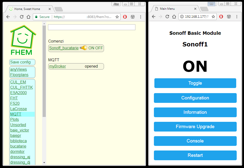 define Sonoff_bucatarie MQTT_DEVICE attr Sonoff_bucatarie IODev myBroker attr Sonoff_bucatarie devStateIcon ON:FS20.on OFF:FS20.off attr Sonoff_bucatarie publishSet ON OFF cmnd/sonoff_kitchen/POWER attr Sonoff_bucatarie room MQTT attr Sonoff_bucatarie stateFormat Lumina attr Sonoff_bucatarie subscribeReading_Lumina stat/sonoff_kitchen/POWER attr Sonoff_bucatarie subscribeReading_Sensor tele/sonoff_kitchen/SENSOR attr Sonoff_bucatarie subscribeReading_Status tele/sonoff_kitchen/STATE attr Sonoff_bucatarie webCmd ON:OFF