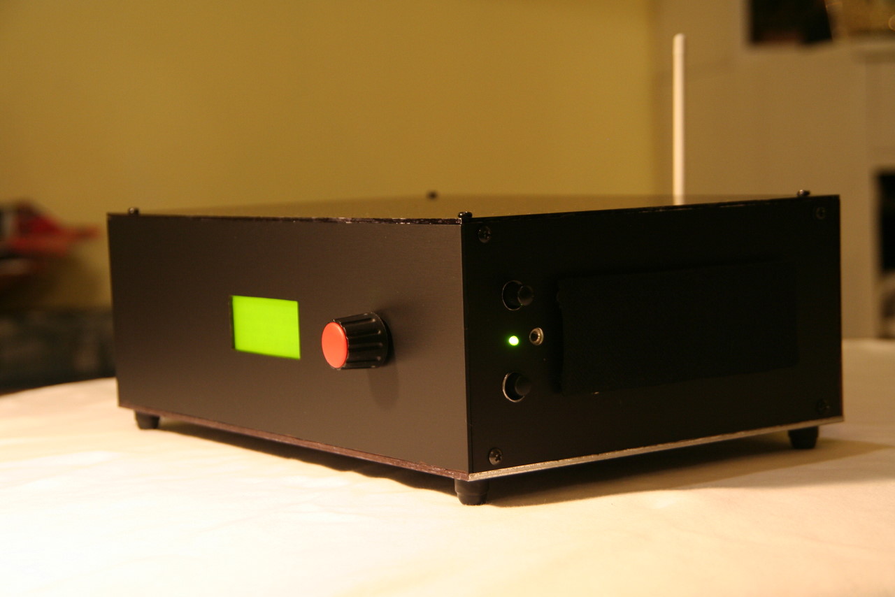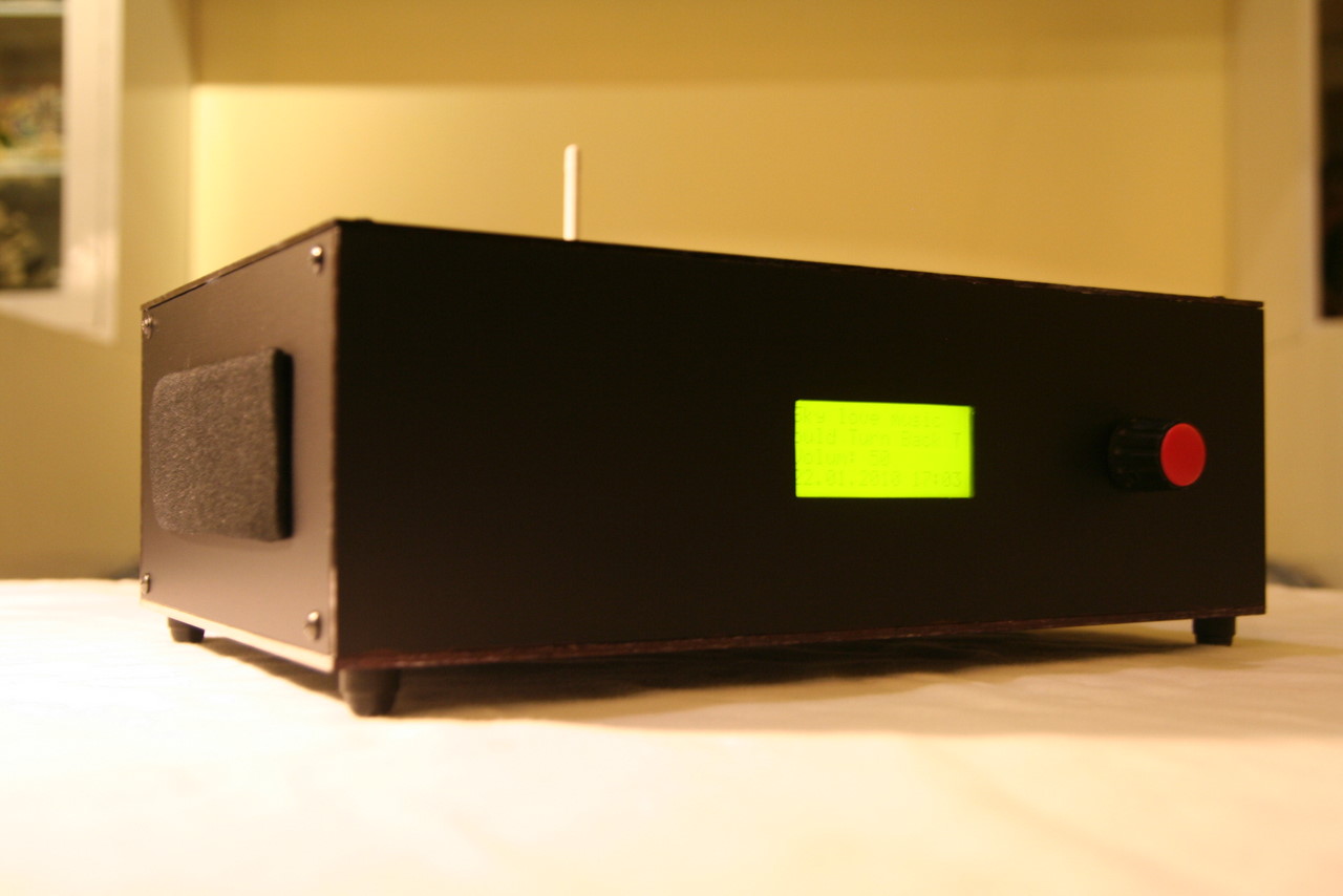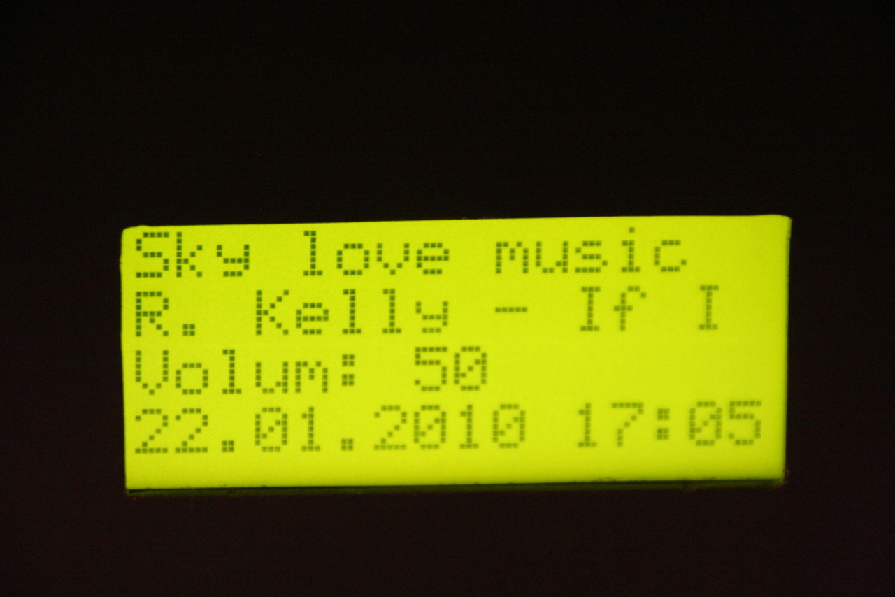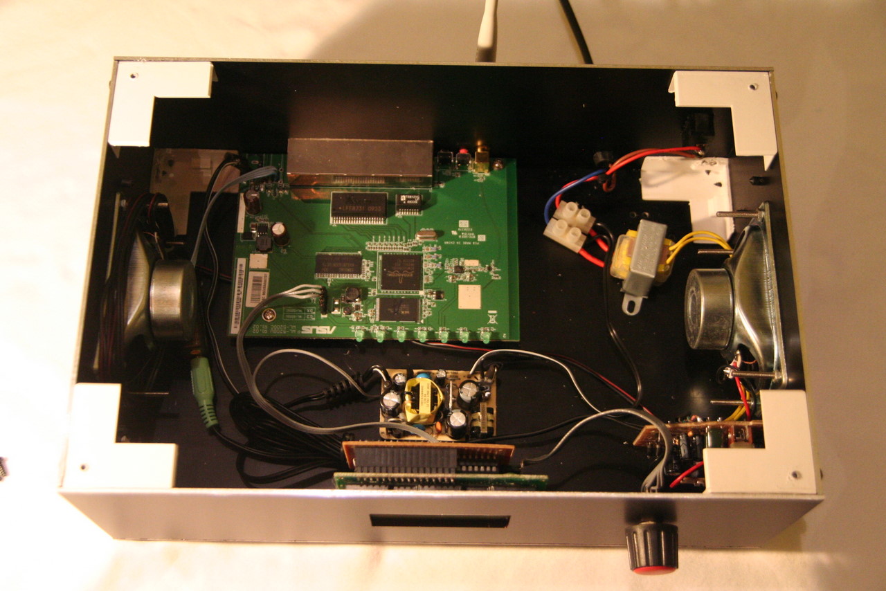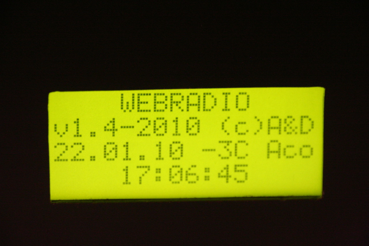 I installed Kamikaze as per MightyOhm's instructions, along with usb sound drivers, mpd - well, the main used software, mpc - for manual interaction, ntpclient for time synch, and radio - the display software I wrote.