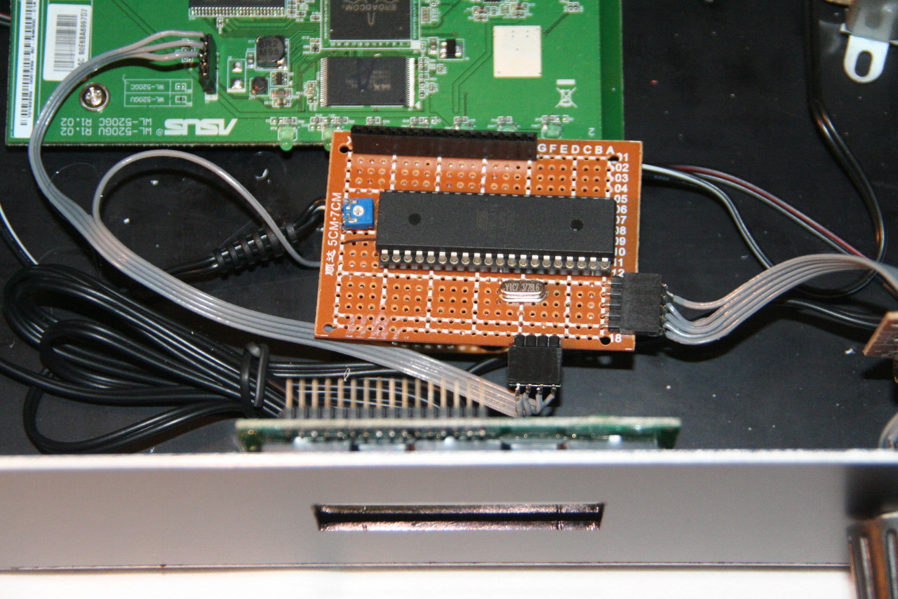 Next I used an microcontroller (AtMega16) to connect to a text-mode (4x16) LCD. Communication from the router to the micro is through /dev/tts/0 (serial 0) at 115200 baud (that's fast enough for a VU meter, if I ever feel the need to implement one).